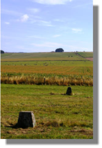 OnesunnymorninglastyearIwentforastrolluptheavenue armedwithmycameraandtookthepicturesshownhere.Atthis smallscalethetumulusisonlyjustvisibleandcanbemadeout justtotheleftoftheclumpoftreesonthehorizon.Ineachcase themoundisframedbetweenthepairsofstoneswiththenearest stone being the left hand one. Forapersonwithadominantrighteyethisproducesanaturalway ofsighting.Forwhatit’sworth,inthiscasetheframingisnot tremendouslytightand,althoughconsistent,seemstoleaveroom forapersontostandonthefarsideoftheavenueinlinewiththe distantmound.Thisisaceremonialprocessionalwaynotan astronomical sighting line.