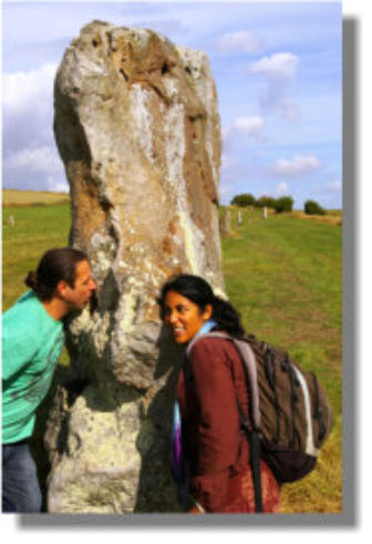 FinallyI’mshowingapictureofacoupleofthepeoplefromaparty ofNewZealandersImetthatday.Iexplainedthealignmentsto themandalsosharedanexperienceI’dhadatoneofthestonesin the S.W. quadrant of the henge. Theyareenjoyingthereverberationsproducedbyhummingintoa recess in the “Bee” stone. Of which more elsewhere and anon.