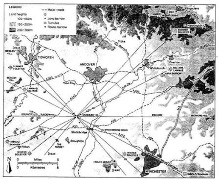 WhilelookingtotheN.E.it’sworthcheckingthemidsummer sunriseline.TheonethatgetssomuchattentionatStonehenge. Whatliesonthehorizoninthatdirection?Theansweristhe villageofHannington(359555),withitschurchyardinaraised enclosureandpondinanovalbankedring,thewholeplace surroundedbyalowbank.Lookingbackdownthelinetowards Daneburyonefinds,withinacoupleofmiles,atumulus,along barrow(507528)andthenanothertumulus.Lookingabitfurther roundtotheN.E.isthelineforthemostnortherlymoonrise whichoccursevery18.6years.Thislinecrossesthehorizonon WatershipDownwhere,notsosurprisinglynow,wefindapairof tumulionthecrestofthehill.BackdownthislinetoDaneburyis a large tumulus (463528) and a “dewpond” at Angledown.The Moon Comes Close JustforvarietywecanchecktheS.E.horizonwherethewinter sunrisesandthelowmoonrisesoccur.HerestandsFarleymount anenormousancientbarrow(404290),nowafolly,whichmarks thepositionwherethemoononitslowestpassageacrossthesky whenitseemsclosesttotheEarth,rises.Thismoundmarksthe placeonthehorizonwherethemoonrisesatitsmostsoutherly swing,whichisinterestinglysomewaypastthesun’sextreme position.Themoonalsodoesitssweepacrosstheskylineeach monthinsteadofthestatelyannualmarchfromtheNorthat midsummertotheSouthatmidwintermadebythesun.In1987I wasabletoobservethelunarrisingsoverbothFarleyMountand Watership Down.ThefollyonFarleyMountwaserectedasamonumenttoahorse called“BewareChalkPits”andconsistsofasmallbuildingerected inthe18thcenturybythehorse’sownerwhohadsurvivedafall intoachalkpitonthehorsewhich,thefollowingyear,wonarace atStockbridgeracecoursewithinsightofthemoundandhillfort at Danebury.Themidwintersunriselineleadstoanothertumulus(425296)on thehorizoninCrabWoodbytheRomanroadintheFarleyMount CountryPark.FurthernorththelinefortheImbolc/Samhain sunriseproducesanothersurprise.ItgoesoutpasttheBeacon,a hilltopclosetoDanebury,overStockbridgeDownwithitstumuli andearthworks,overWinchesterandTelegraphHill,over WarnfordandKingJohn’sHouseandfinallyuptothelongbarrow (672201)onSaltHillsouthofEastMeon.Thisisthelongestlineof allandbecauseSaltHillis230metreshighitisjustintervisible withDanebury.Itwouldseemthatthesystemextendedovera verywideareaandmusthaveinvolvedintertribalcooperation. TheequinoctialsunriselinetotheEastdoesnothaveaveryclear indicatoronit,althoughtherearesomesuggestivepointsatthe trigpointatBugmoreHillnearGodsfieldCopseandthetumulus north of Medstead (653377).Towards the West and the setting pointsTurningnowtothewesternsideofthe“LandscapeCalendar”we canlookfirstatthemostsoutherlymoonset.Thispointismarked byabeautifuland,onceagainlarge,mound(290330)calledthe TurretonWhiteshootHillnearBroughton,nowtragicallybeing steadilyreducedbyploughing.Themidwintersunsetlineisalso markedbyalargemound(258330)beingsacrificedtothecrops ofwheatwhichhavereplacedtheubiquitoussheepwhichusedto croptheshortgrassofalltheuplandsofHampshire.Thisisjust tothenorthoftheintriguinglynamed“KhyberPass”attheN.W. endofBroughtonDown.TheImbolc/Samhainlineseemstorun tothe“Settlement”(260349)inAshleysCopse.Thisisa mysteriousand,tome,slightlysinisterenclosure,thebanksof whicharemadewithroundedpebbleswhichseemoutofplacein countryofchalkandflint.It’ssetinawoodwhich,onthe afternoonIvisitedit,washumidandclammywithanatmosphere ofsecrecyandisolation.OntheequinoxlinetotheEastthereisa tumulusontheNorthernslopeofSuddernHill(266378).Thisis nolongeraccessiblebecauseitisbehindthefenceserectedby theMinistryofDefencewhentheyenclosedandsealedoffPorton Down.Infacteventryingtoseethemoundwithbinocularsledto mebeingchasedoffbysomeheaviesinacarthatmadean immediate appearance when I stopped.