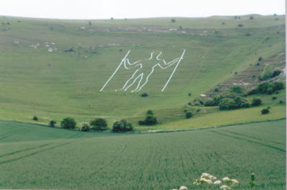 The Long Man of Wilmington or Wilmington Giant is a hill figure on the steep slopes of Windover Hill near Wilmington, East Sussex, England. It is 6 miles (9.7 km) northwest of Eastbourne and 1⁄3 mile (540 m) south of Wilmington. Locally, the figure was once often called the "Green Man".[1] The Long Man is 235 feet (72 m) tall,[2] holds two "staves", and is designed to look in proportion when viewed from below..