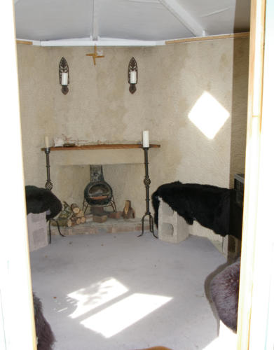 A10'wideoctagonalmeditationandmeetingspace.All madewithrecycledmaterials.Wallsof"Papercrete", mashedupGuardiannewspaper70%,sand20%and cement10%.Oldfencepanelscutupforroofshingles, toppedwithreversedbeercansandaglasspyramid. Insidealittlechimeniainthebackcornerforwinter heat.Benchseatswithsheepskinsallroundandplenty of candles.