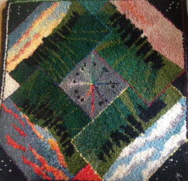 •Firstly to encapsulate in visual form ideas that have interested me, many of which are tackled in this website. •Secondly to have a diagram which I can use as the basis of a workshop. Many of these are in a circle of people sitting on the ground in a circle in a tent and I like the informality and matter of factness of a carpet that can be walked on. •Thirdly the rugs formed the basis of Yuletide cards that I sent to family and friends each year